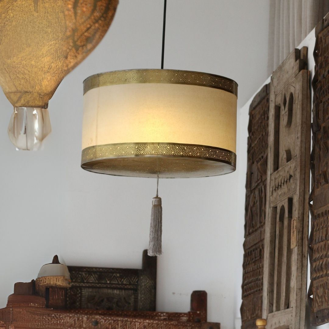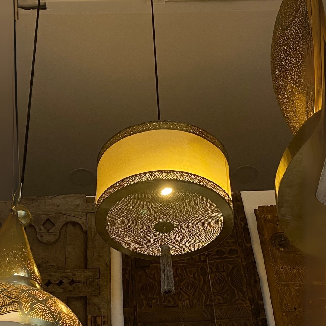 Lampara de tambor estilo marroquí diseño colgante con detalles decorativos en metal y tejido. se vende por pieza