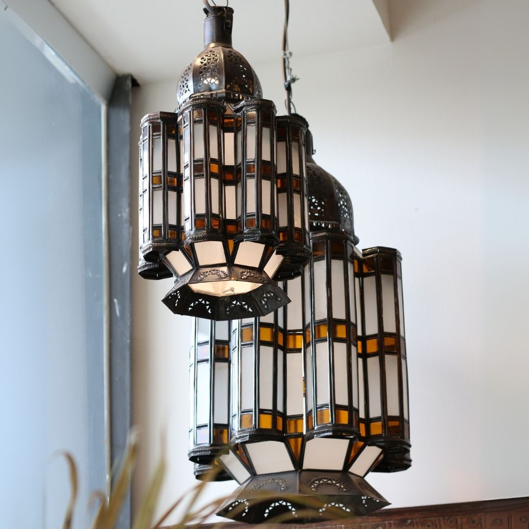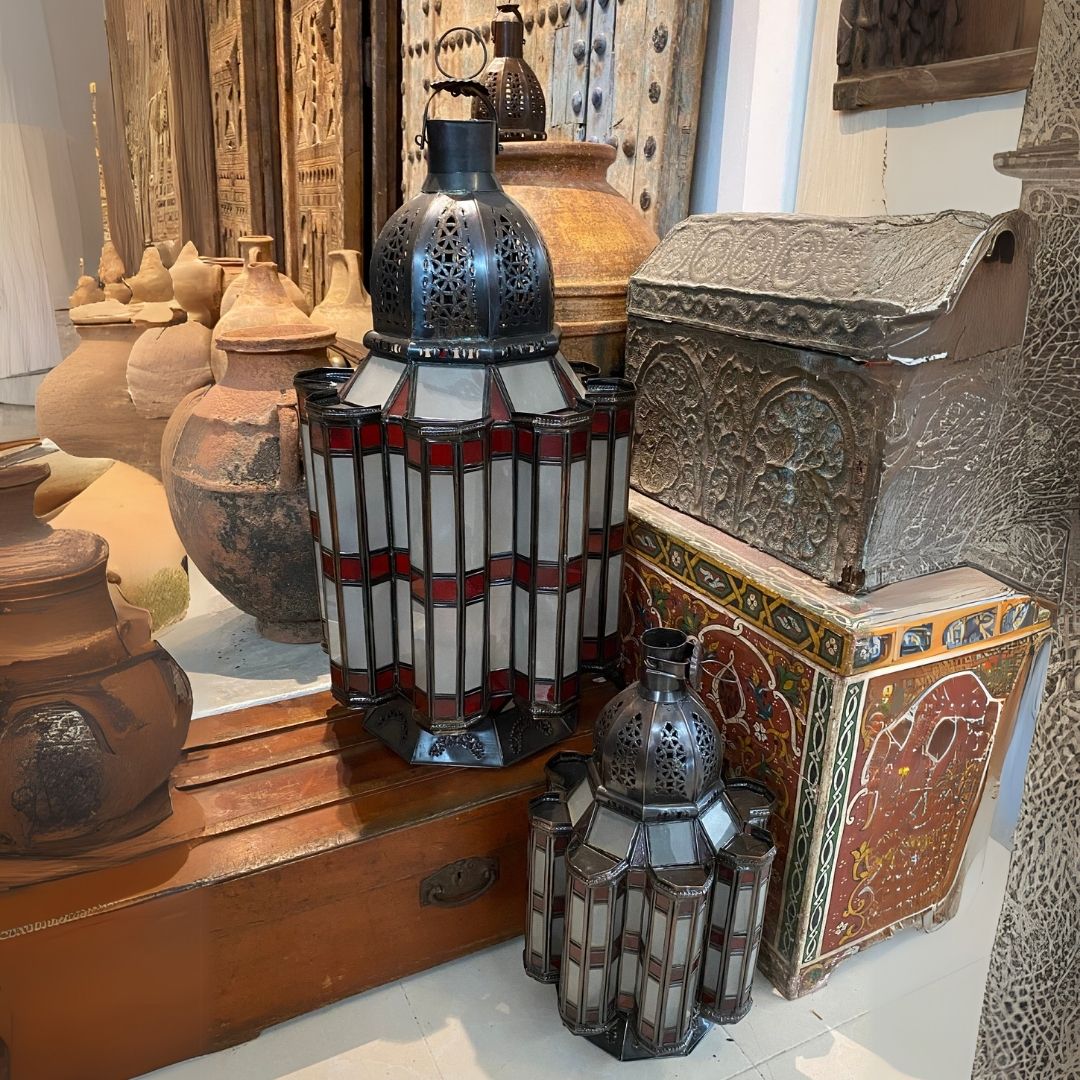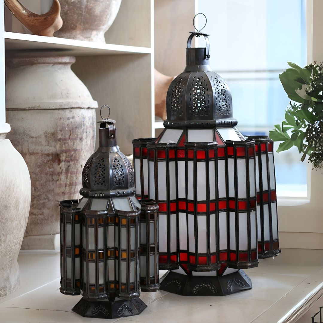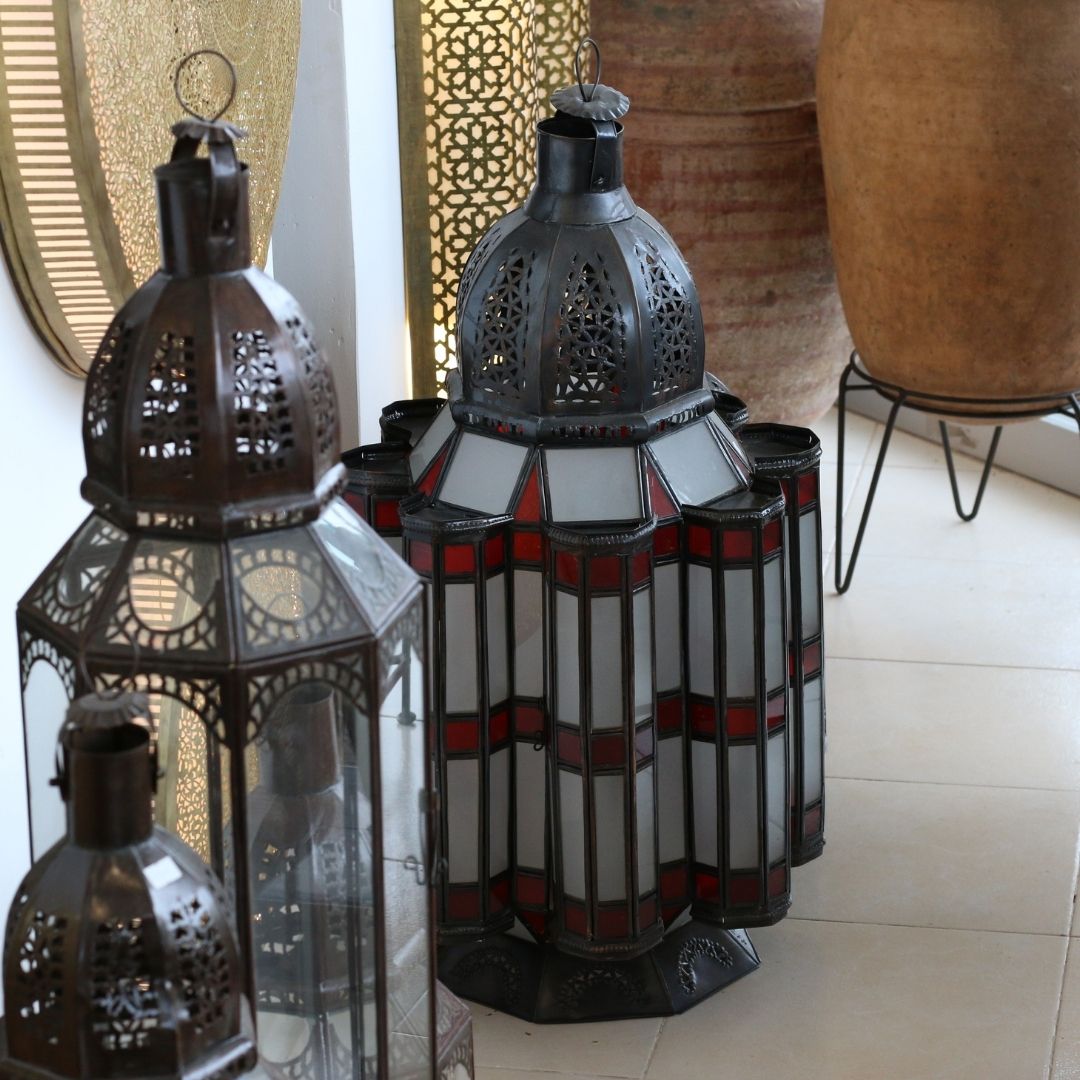 En el corazón de Marrakech, entre los laberinticos zocos de la medina, un viejo artesano llamado Youssef forjaba lámparas únicas en su pequeño taller. una de sus obras mas especiales fue esta lampara de hierro calado, adornada con cristales de colores rojo intenso y blanco lechoso la diseño como homenaje a su esposa, Amina quien amaba los atardeceres rojizos del desierto y la pureza de la luz de la luna sobre las dunas. Es la esencia mágica del marruecos antiguo.